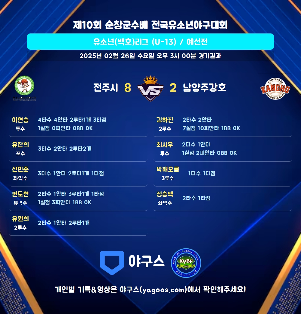 | 2루타 | 신민준(10) 이현승(27) 유찬희(18) 유원희(23) |