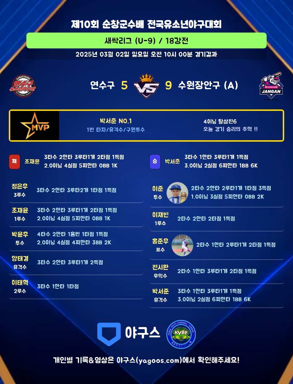 | 1 | 투 | 박윤우(15) | 좌선G홈/솔로홈런) | 투내안 | - | 아웃/2땅 | 아웃/유땅 | 4 | 2 | 1 | 1 | 1 | - | - | - | 0.500 |