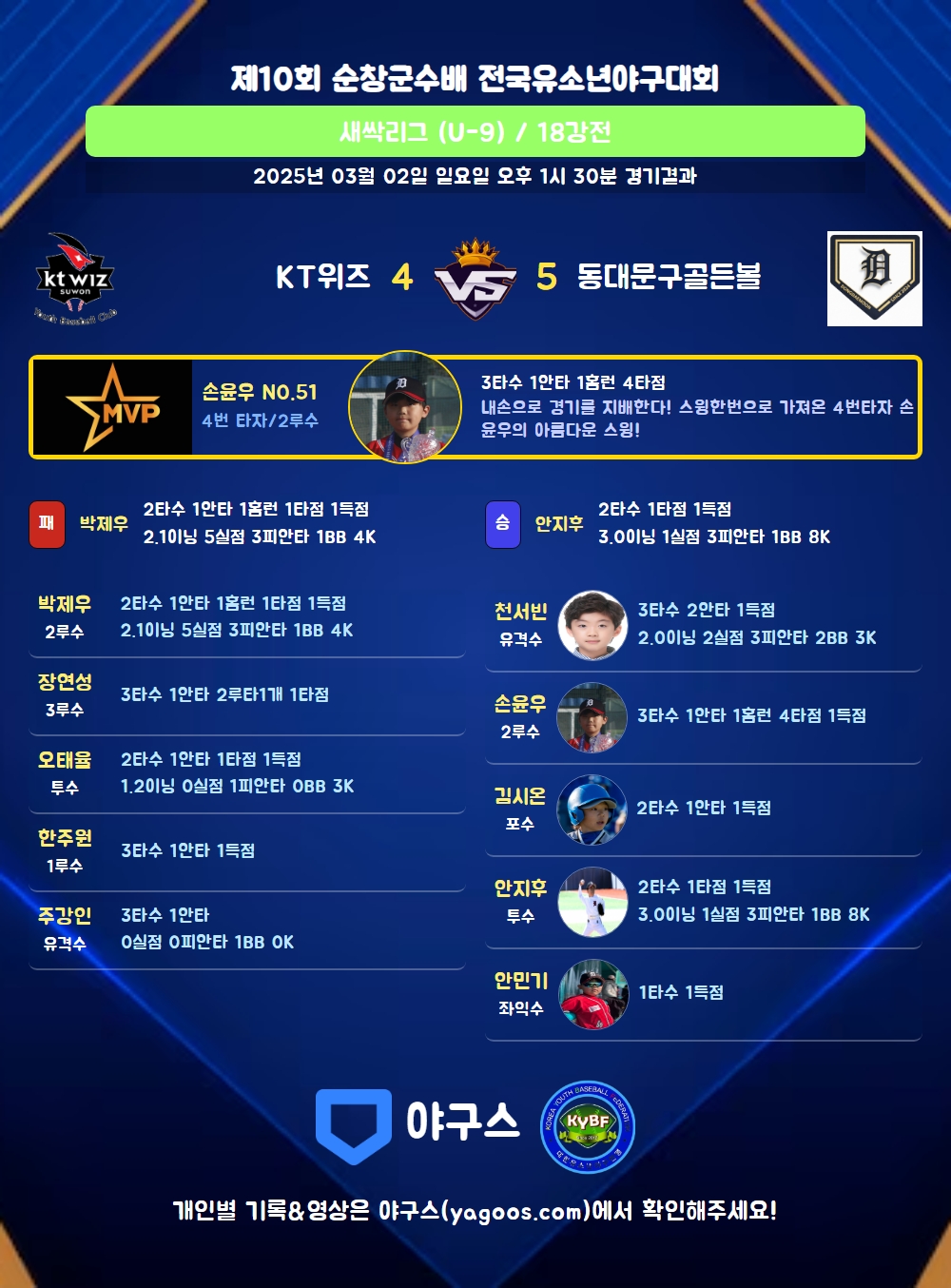 | 1 | 박제우(17) | 패 | 2.1 | 13 | 11 | 3 | 1 | 4 | 4 | 51 | 5 | 2 | 2.00 |