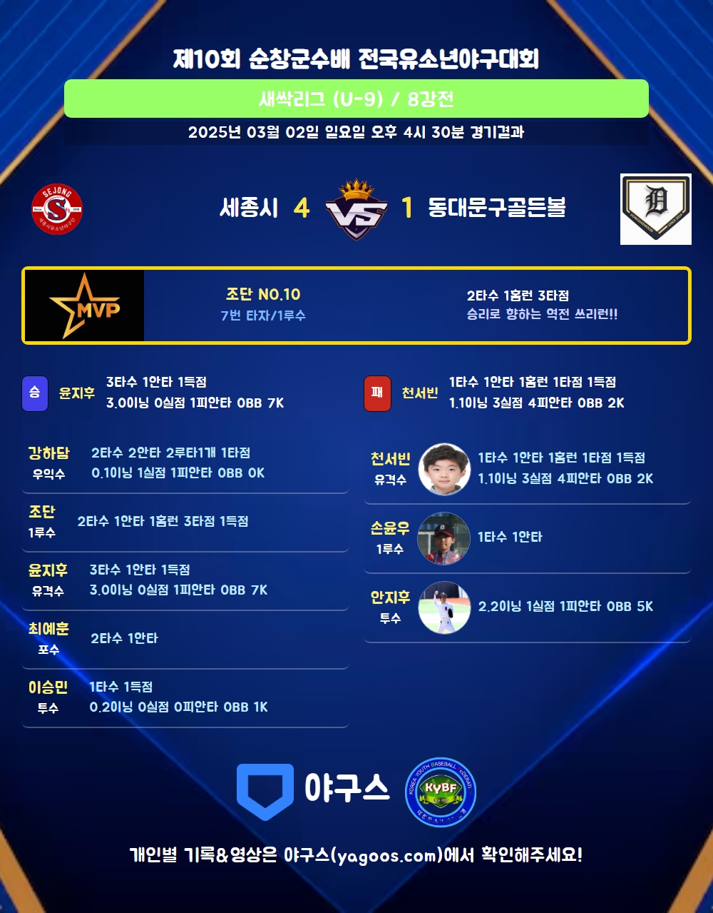 | 홈런 | 조단(10) 천서빈(99) |