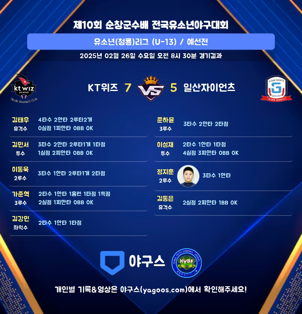 | 일산자이언츠 | 0 | 0 | 0 | 3 | 2 | 0 | 5 | 4 | 2 | 5 | 5 |
