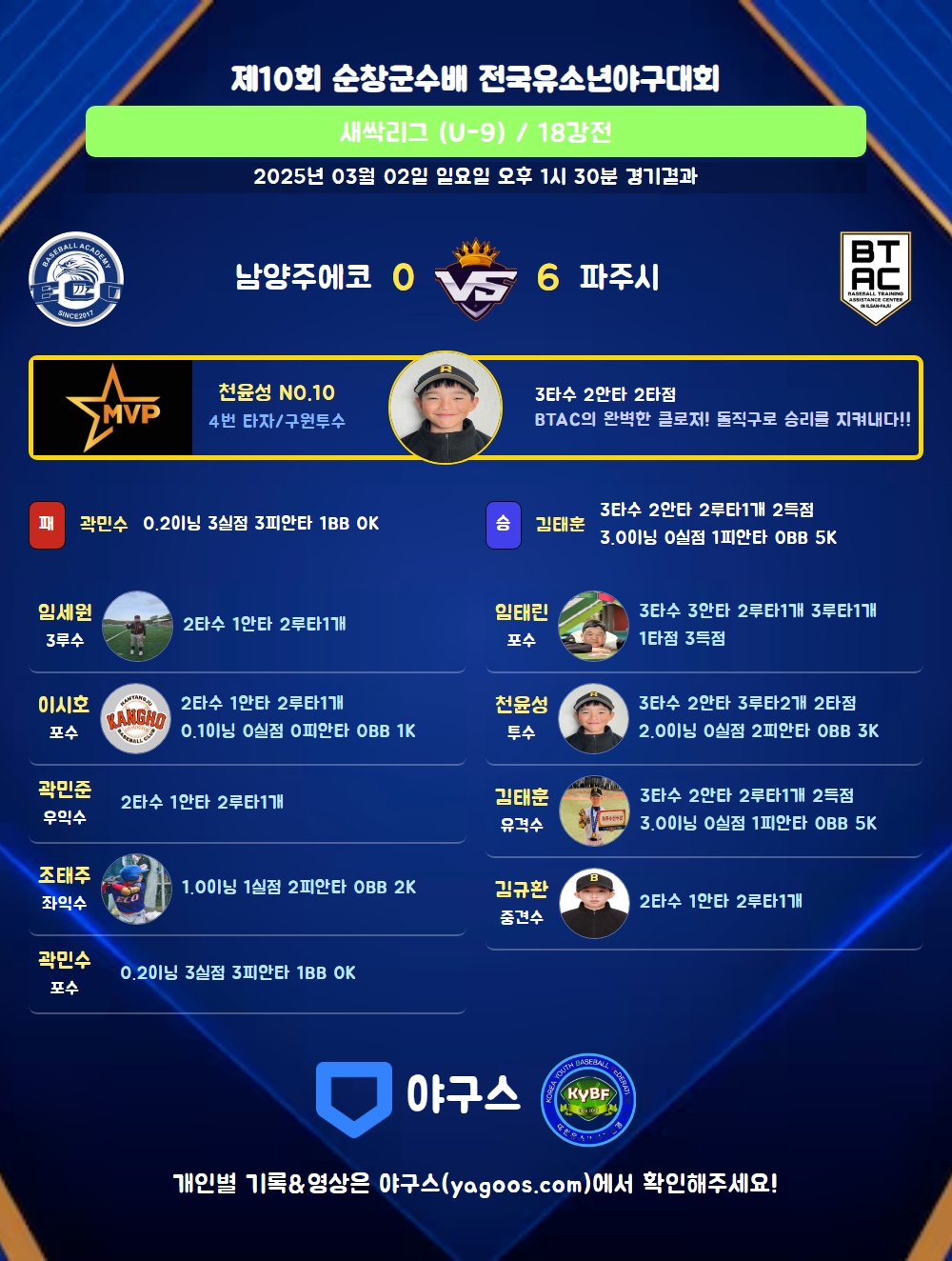 | 파주BTAC | 3 | 1 | 0 | 2 | 0 | 6 | 8 | 0 | 4 | 4 |