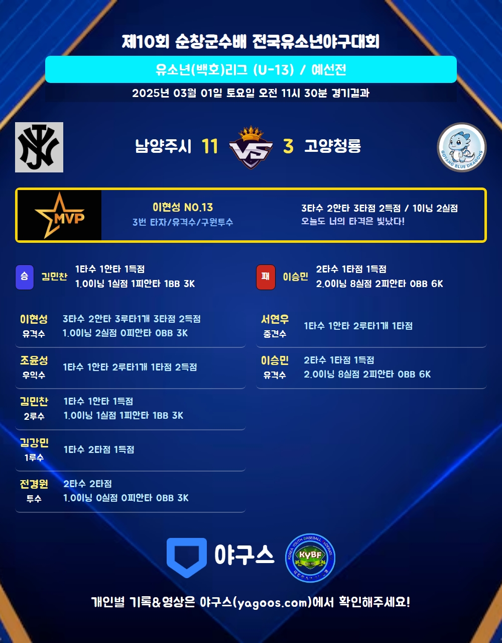 | 고양청룡 | 2 | 1 | 0 | 0 | 0 | 0 | 3 | 1 | 3 | 6 | 3 |