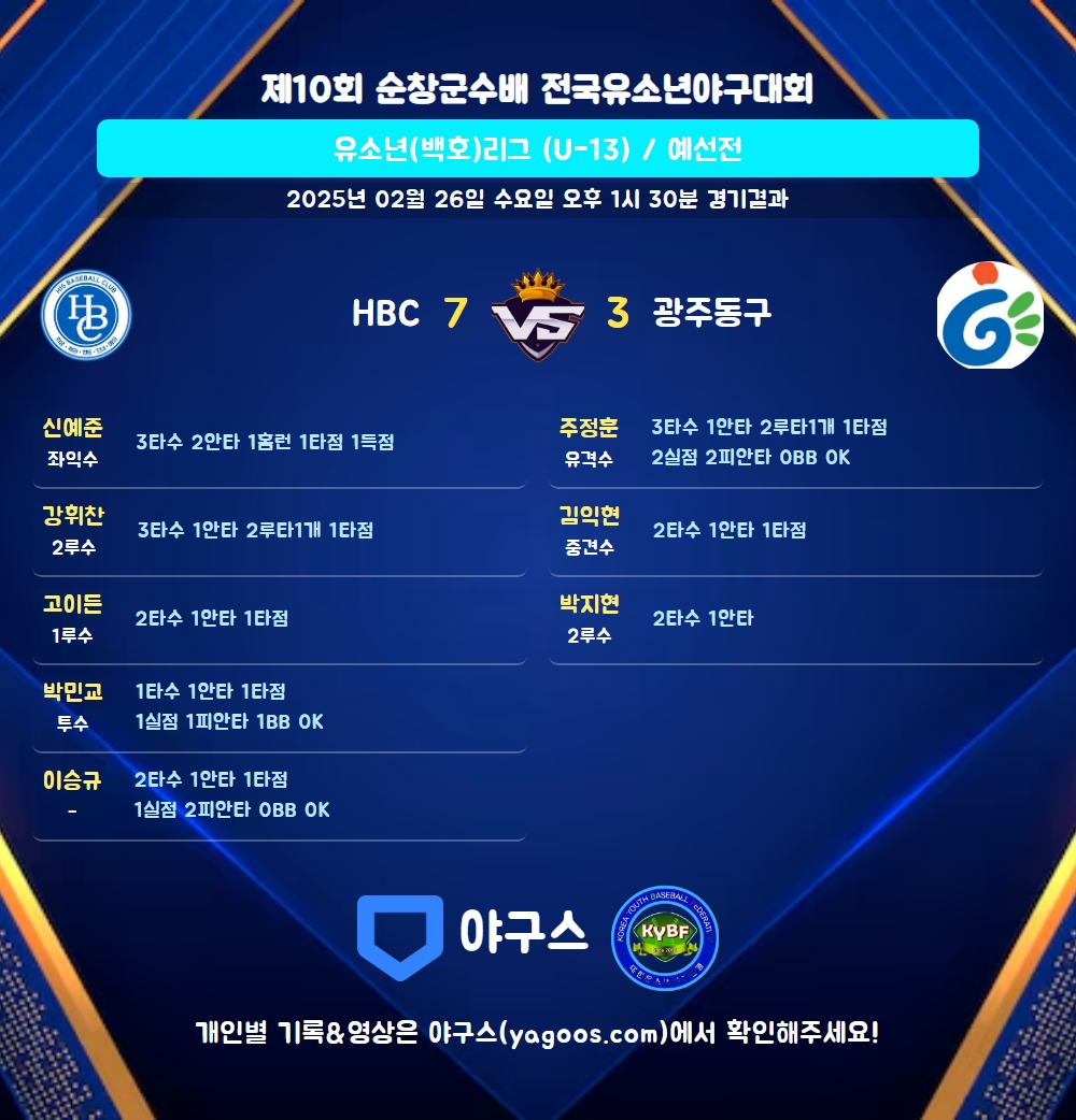 | 7 | 二 | 강휘찬(61) | - | 삼진 | - | 좌중2 | 삼진 | - | 3 | 1 | 1 | - | - | - | - | 2 | 0.333 |