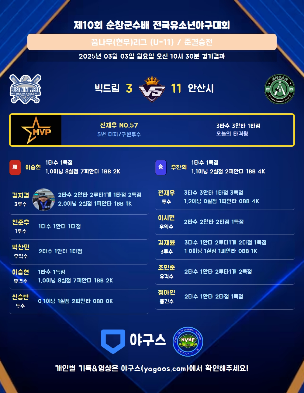 | 3 | 포 | 우찬희(98) | 사구/아웃/유플 | - | 4구/아웃/태그아웃 | - | - | 1 | - | - | 1 | - | 2 | 2 | - | 0.000 |