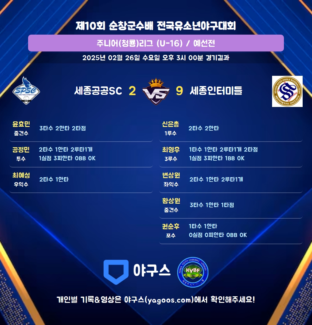 | 2루타 | 공정민(5) 변상원(8) 최영우(7) |