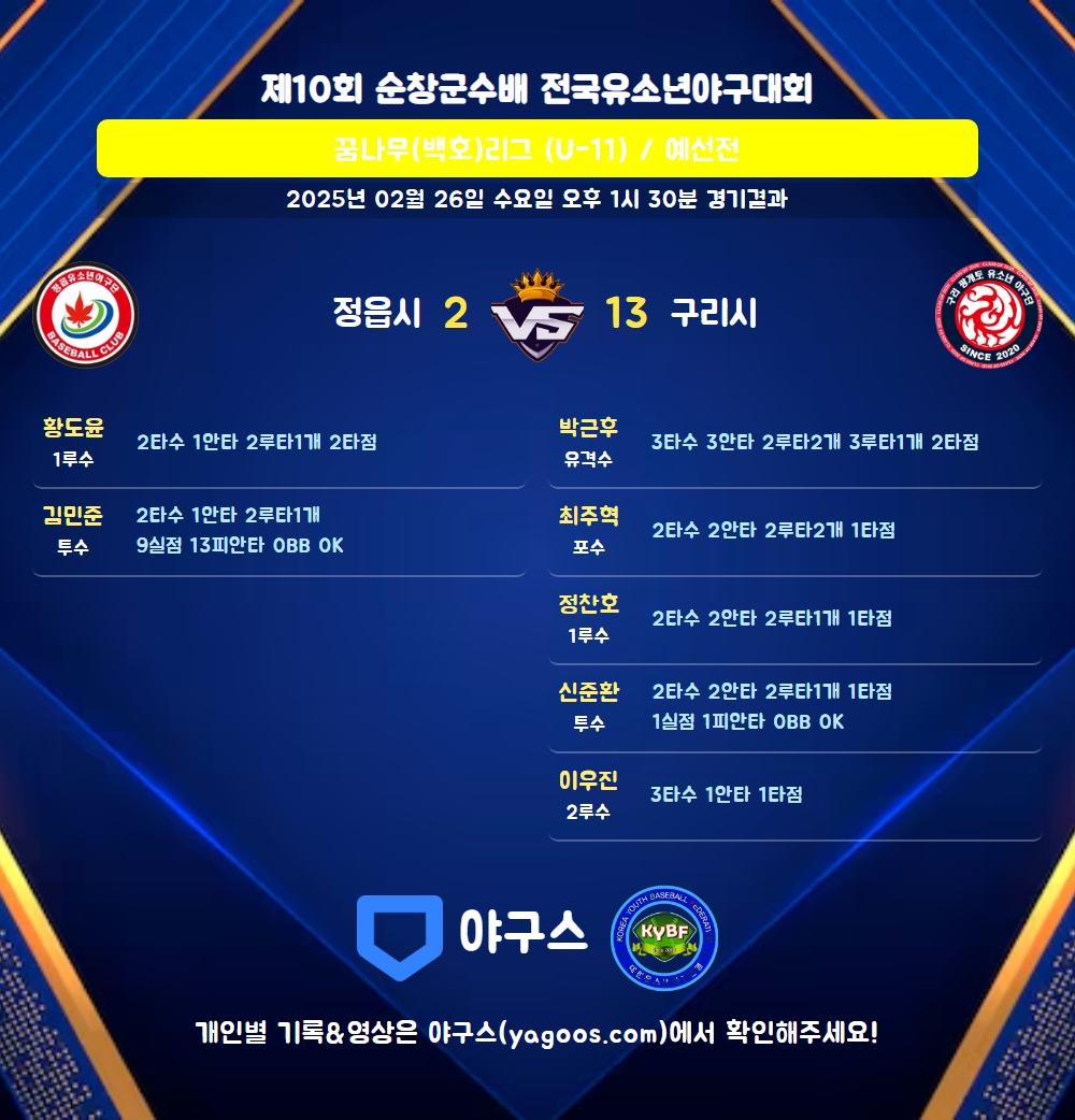 | 2루타 | 김민준(13) 황도윤(47) 박근후(7) 정찬호(19) 최주혁(31) 신준환(2) |