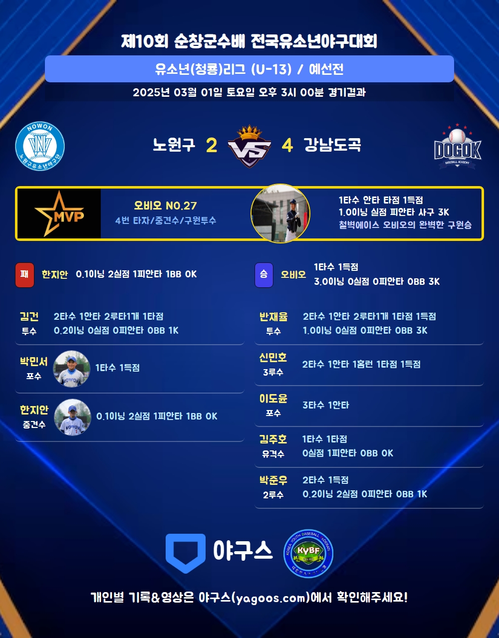 | 3 | 오비오(27) | 승 | 3.0 | 10 | 10 | - | - | 2 | 3 | 34 | - | - | 0 |