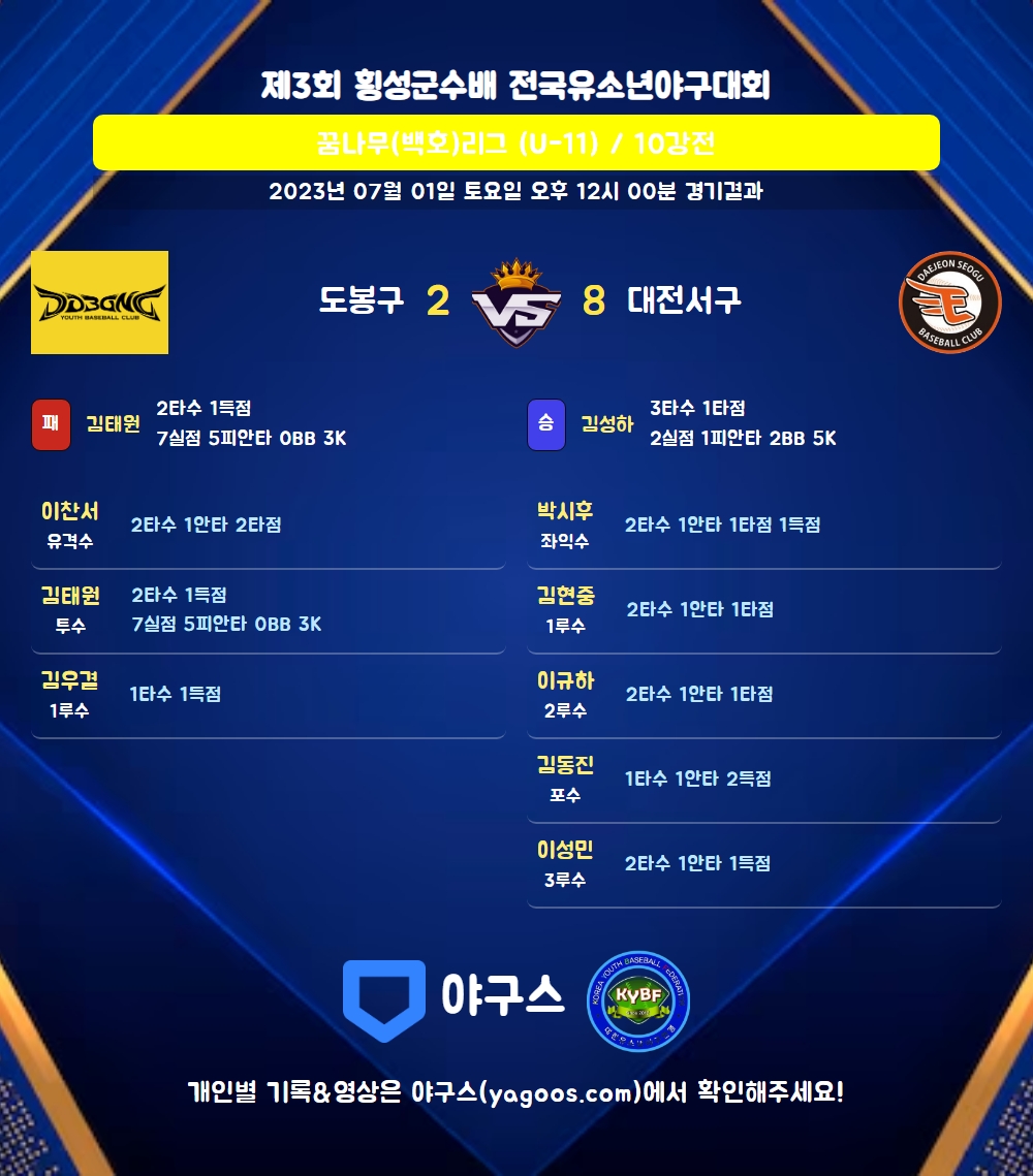 | 대전서구 | 2 | 5 | 1 | 0 | 8 | 7 | 0 | 5 |