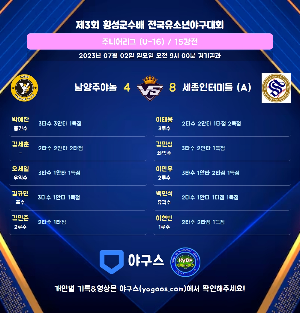 | 8 | 三 | 이태웅(18) | - | - | 우월3 | 좌전안 | - | 2 | 2 | 1 | 2 | 0 | 0 | - | 0 | 1.000 |