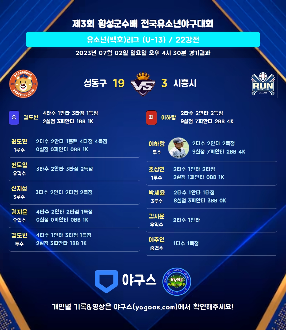 | 3 | 三 | 박세윤(22) | 유땅 | - | 좌중3 | - | 2 | 1 | 1 | 0 | 0 | 0 | - | 0 | 0.500 |