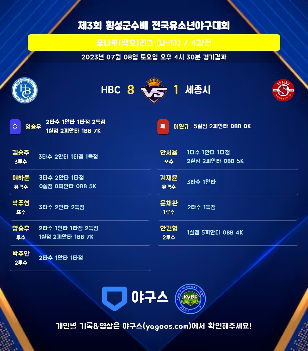 | 1 | 양승우(99) | 승 | - | 12 | 8 | 2 | 0 | 2 | 7 | 51 | 1 | 1 | 0 |