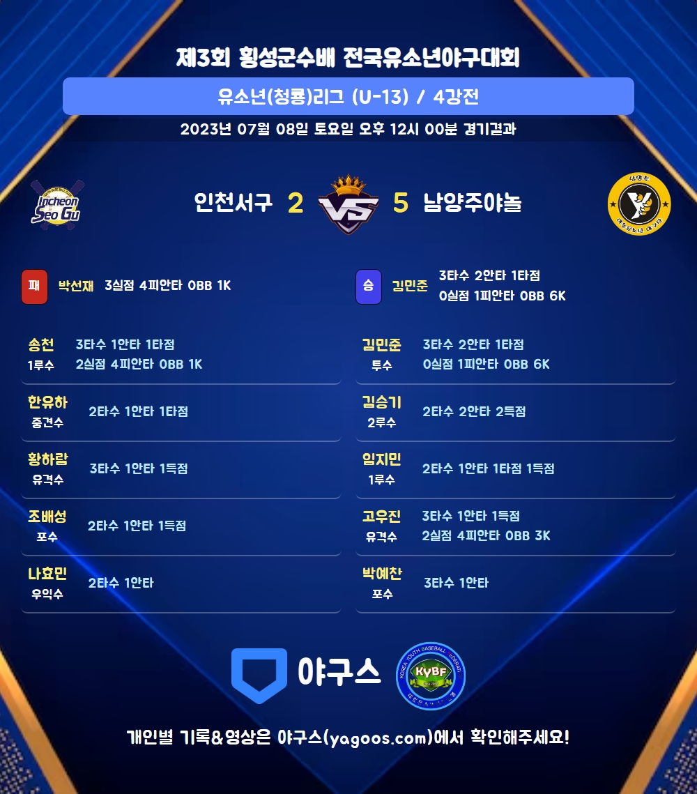 | 4 | 포 | 박예찬(24) | 중전안 | - | 3땅 | - | 투땅 | - | 3 | 1 | 0 | 0 | 0 | 1 | - | 0 | 0.333 |