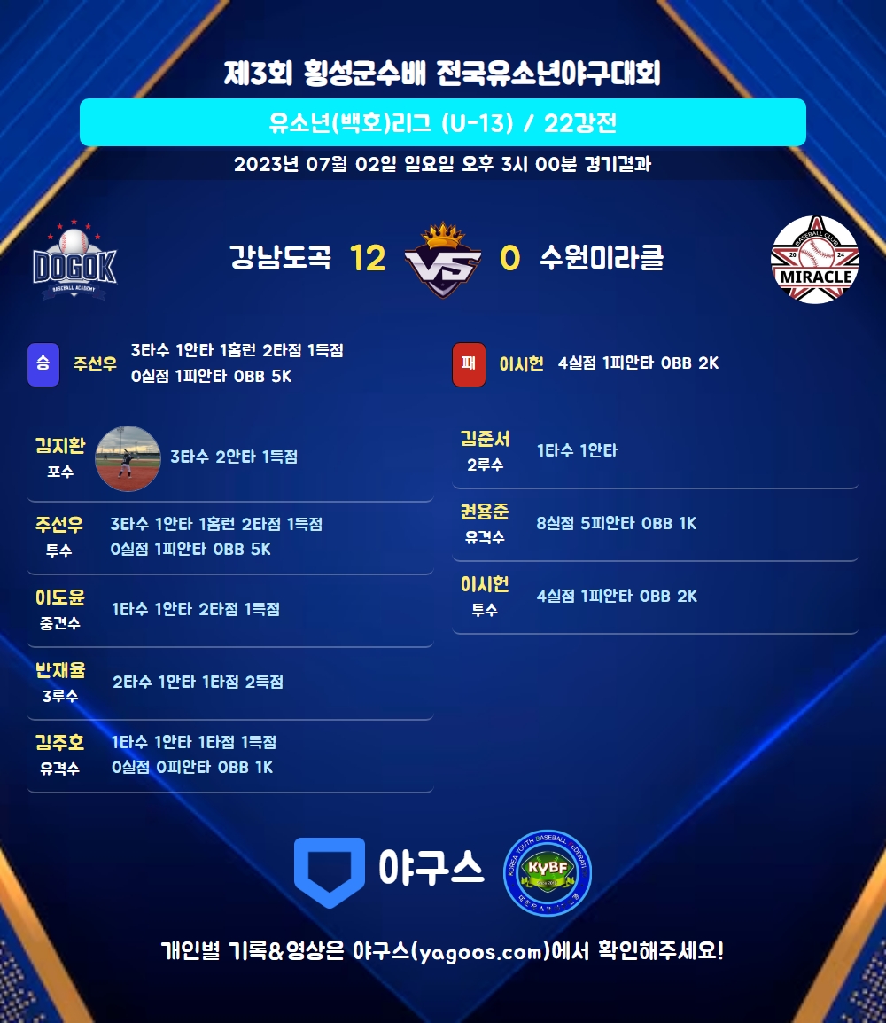 | 1 | 주선우(12) | 승 | - | 7 | 1 | 1 | 0 | - | 5 | 35 | 0 | 0 | 0 |