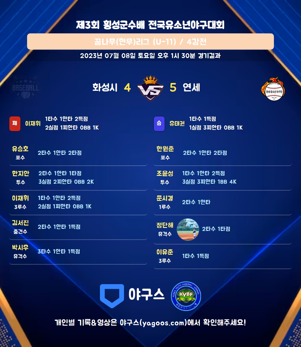 | 4 | 포 | 유승호(10) | 4구 | - | 유내안 | - | 2플 | 2 | 1 | 2 | 0 | 0 | 2 | 1 | 0 | 0.500 |