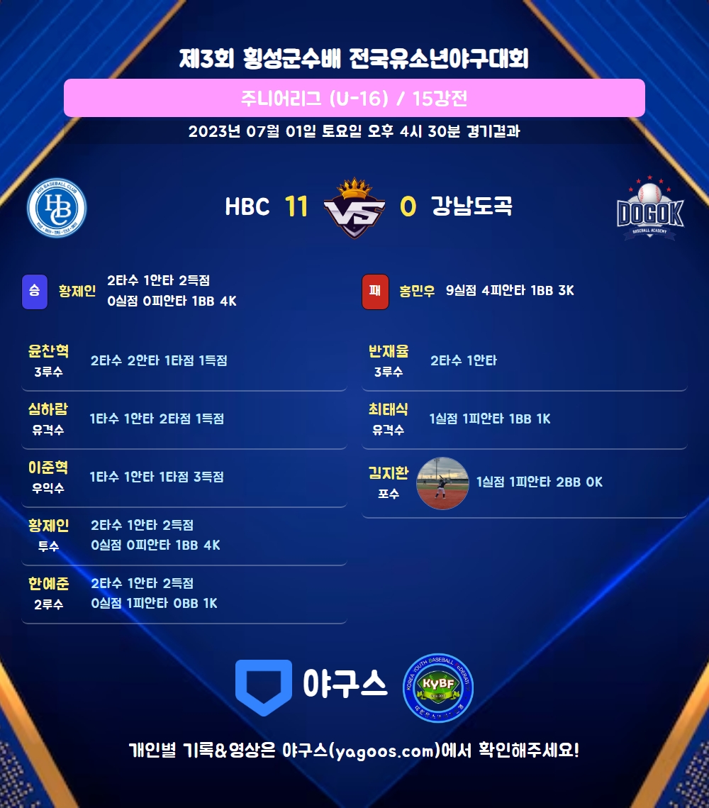 | 4 | 우 | 이준혁(11) | 우전안 | 4구 | 사구 | - | 1 | 1 | 1 | 3 | 0 | 0 | 2 | 0 | 1.000 |