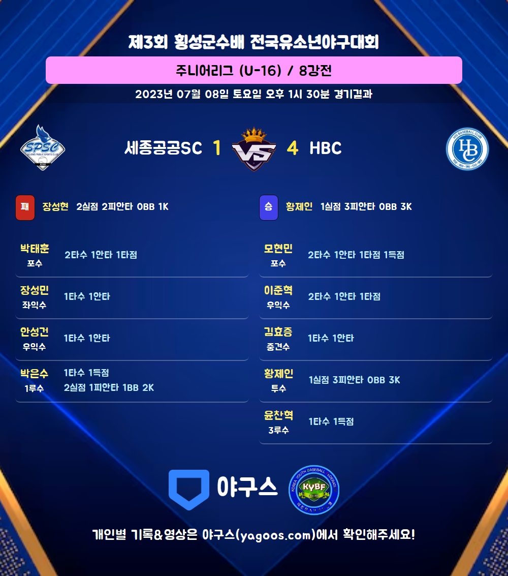 | 3 | 포 | 박태훈(7) | 유땅 | - | 좌전안 | - | 2 | 1 | 1 | 0 | 0 | 0 | - | 0 | 0.500 |