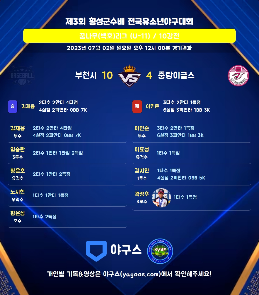 | 중랑이글스 | 3 | 0 | 1 | - | 4 | 2 | 3 | 8 |