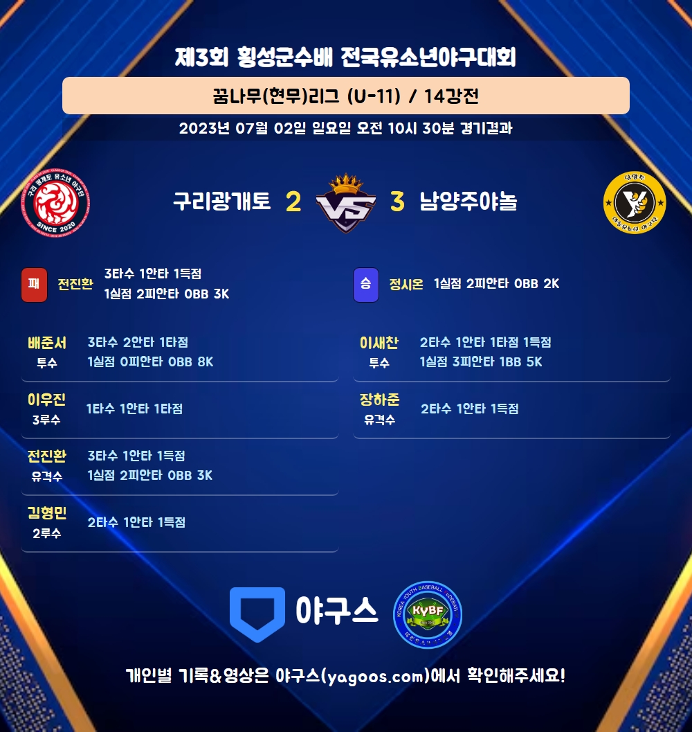 | 3 | 투 | 이새찬(47) | 삼진 | - | - | 좌전3 | - | 2 | 1 | 1 | 1 | 0 | 0 | - | 1 | 0.500 |