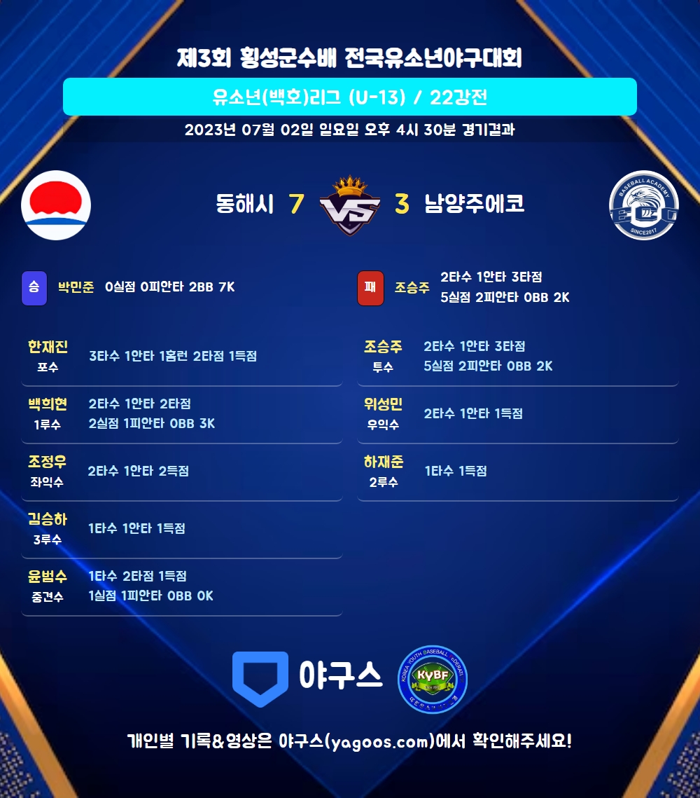 | 1 | 박민준(36) | 승 | - | 14 | 0 | 0 | 0 | 5 | 7 | 68 | 0 | 0 | 0 |