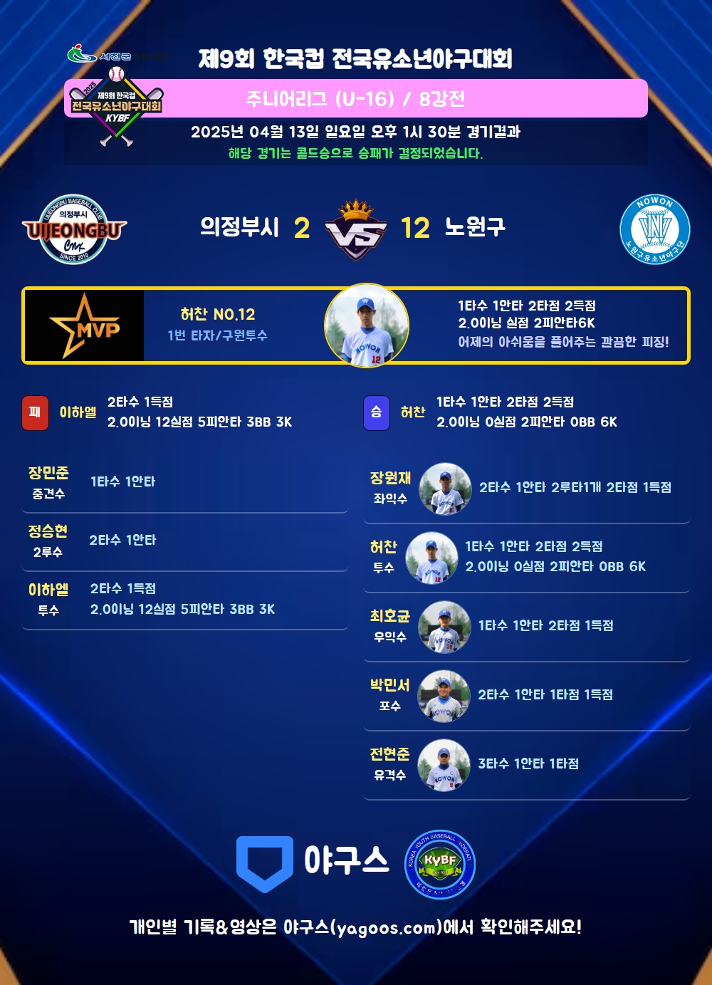 | 3 | 허찬(12) | 승 | 2.0 | 9 | 8 | 2 | - | 1 | 6 | 47 | - | - | 0 |