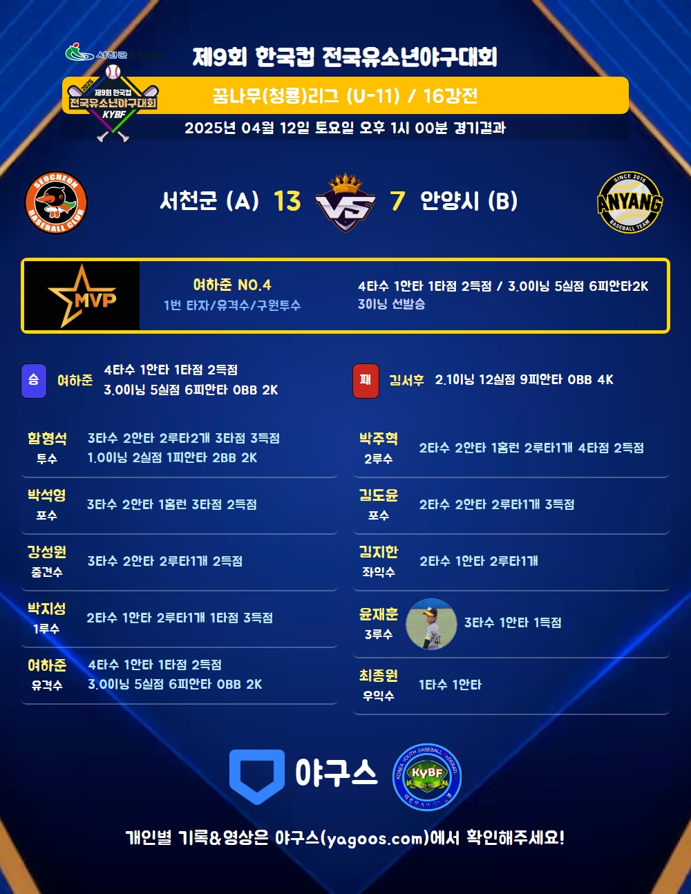 | 1 | 유 | 여하준(4) | 투땅 | 3내안(1타점) | 1실 | 1땅 | - | - | 4 | 1 | 1 | 2 | - | 1 | - | - | 0.250 |