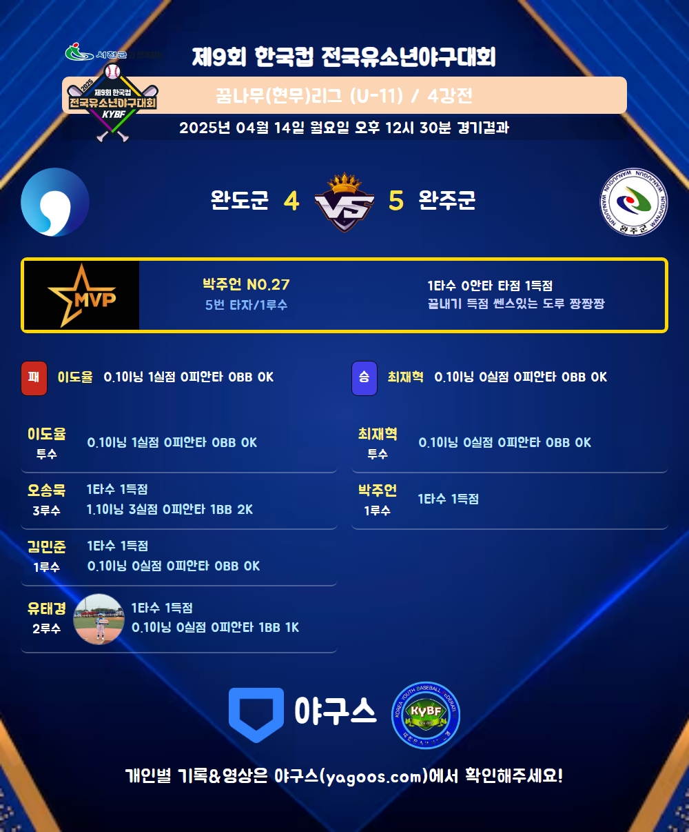 | 2 | 최재혁(5) | 승 | 0.1 | 1 | 1 | - | - | - | - | 4 | - | - | 0 |