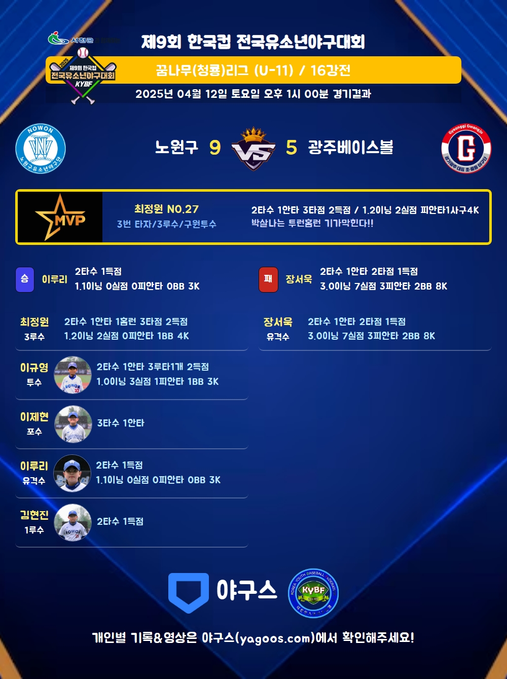 | 광주베이스볼 | 0 | 2 | 0 | 3 | 0 | 0 | 5 | 1 | 2 | 11 | 6 |
