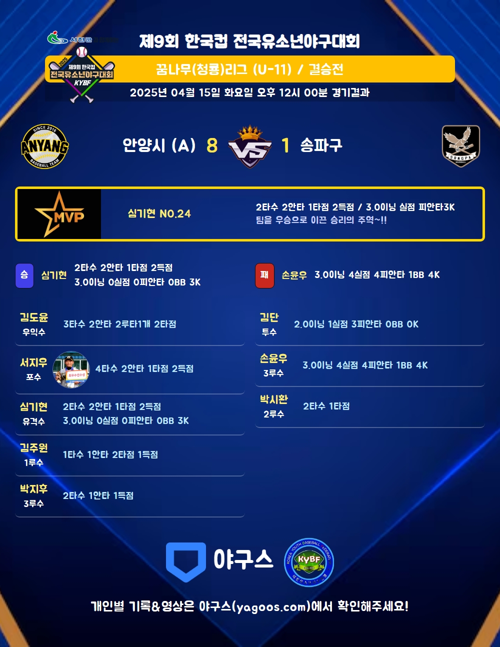 | 9 | 三 | 박지후(12) | - | 1땅 | - | 4구 | 우안 | - | 2 | 1 | - | 1 | - | 1 | 1 | - | 0.500 |