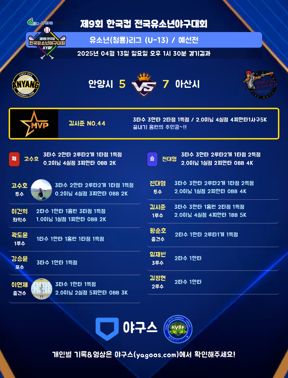 | 3 | 一 | 김시준(44) | 중안 | - | 중안 | 우중홈(2타점) | - | - | 3 | 3 | 2 | 1 | 1 | - | - | - | 1.000 |
