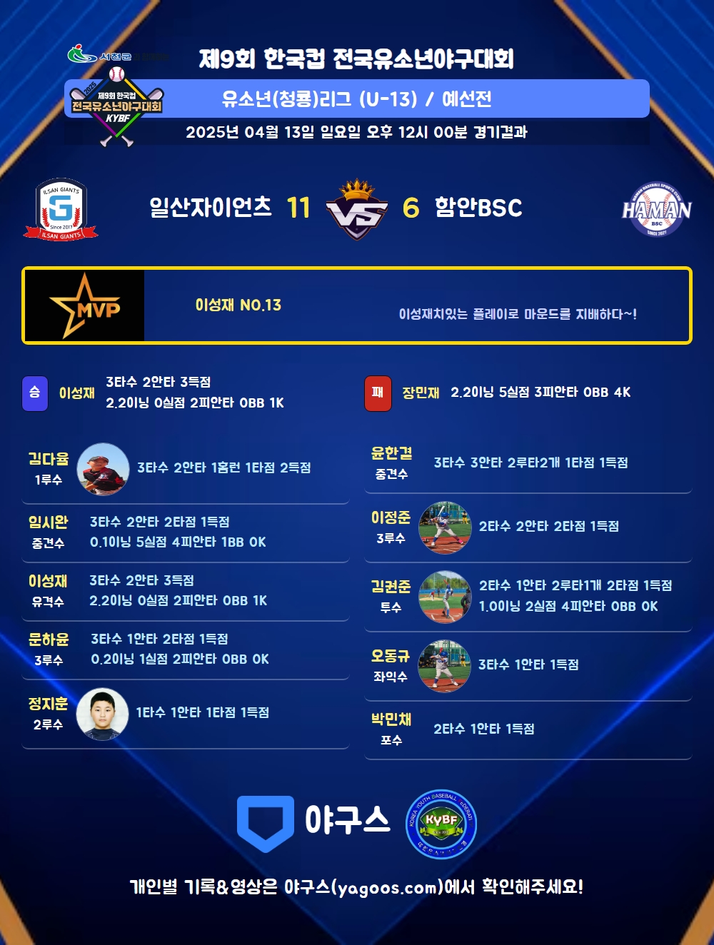 | 일산자이언츠 | 4 | 5 | 0 | 2 | 0 | 0 | 11 | 11 | 1 | 3 | 3 |