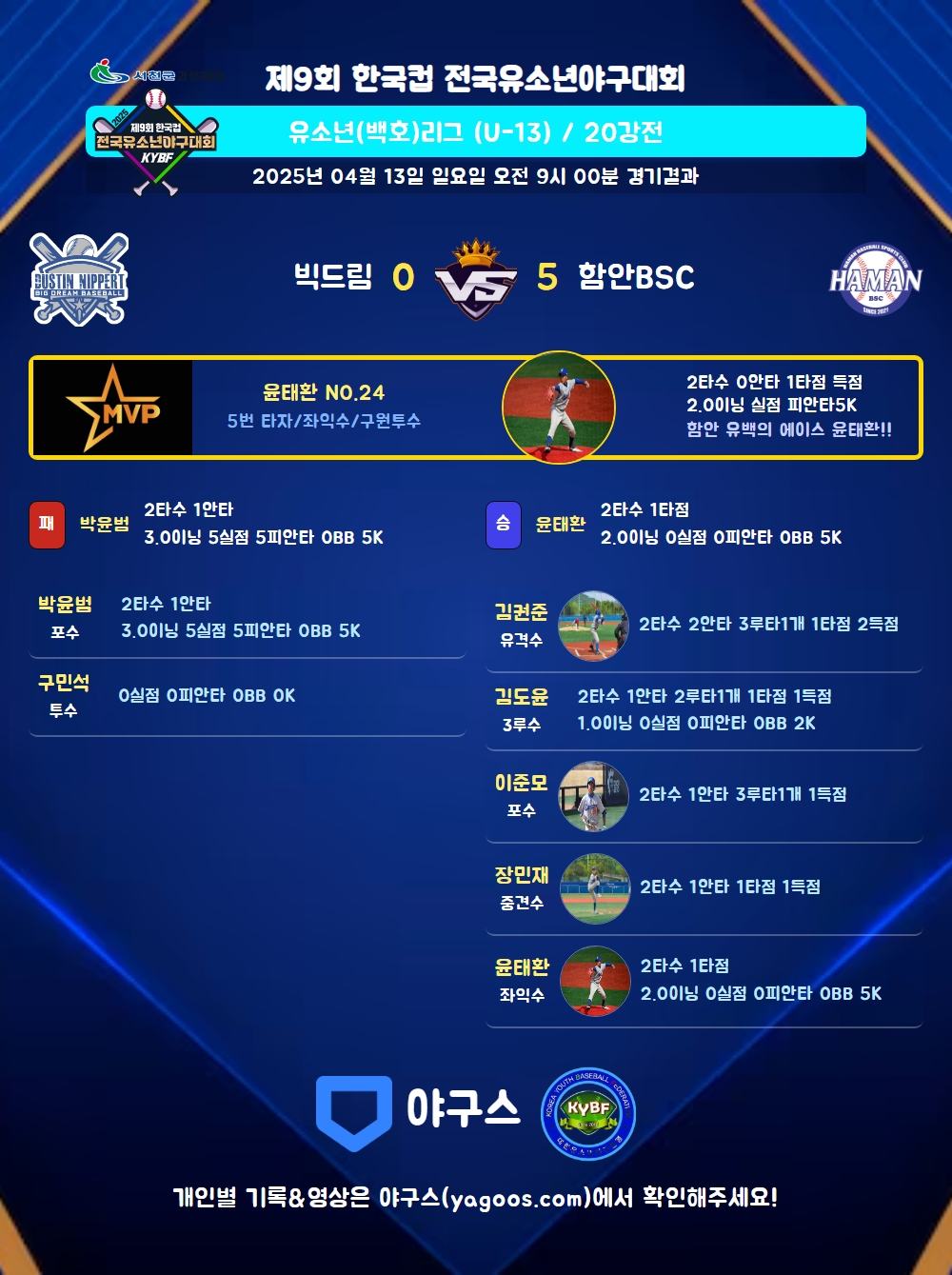 | 함안BSC | 1 | 0 | 4 | 0 | 0 | 0 | 5 | 5 | 1 | 2 | 2 |