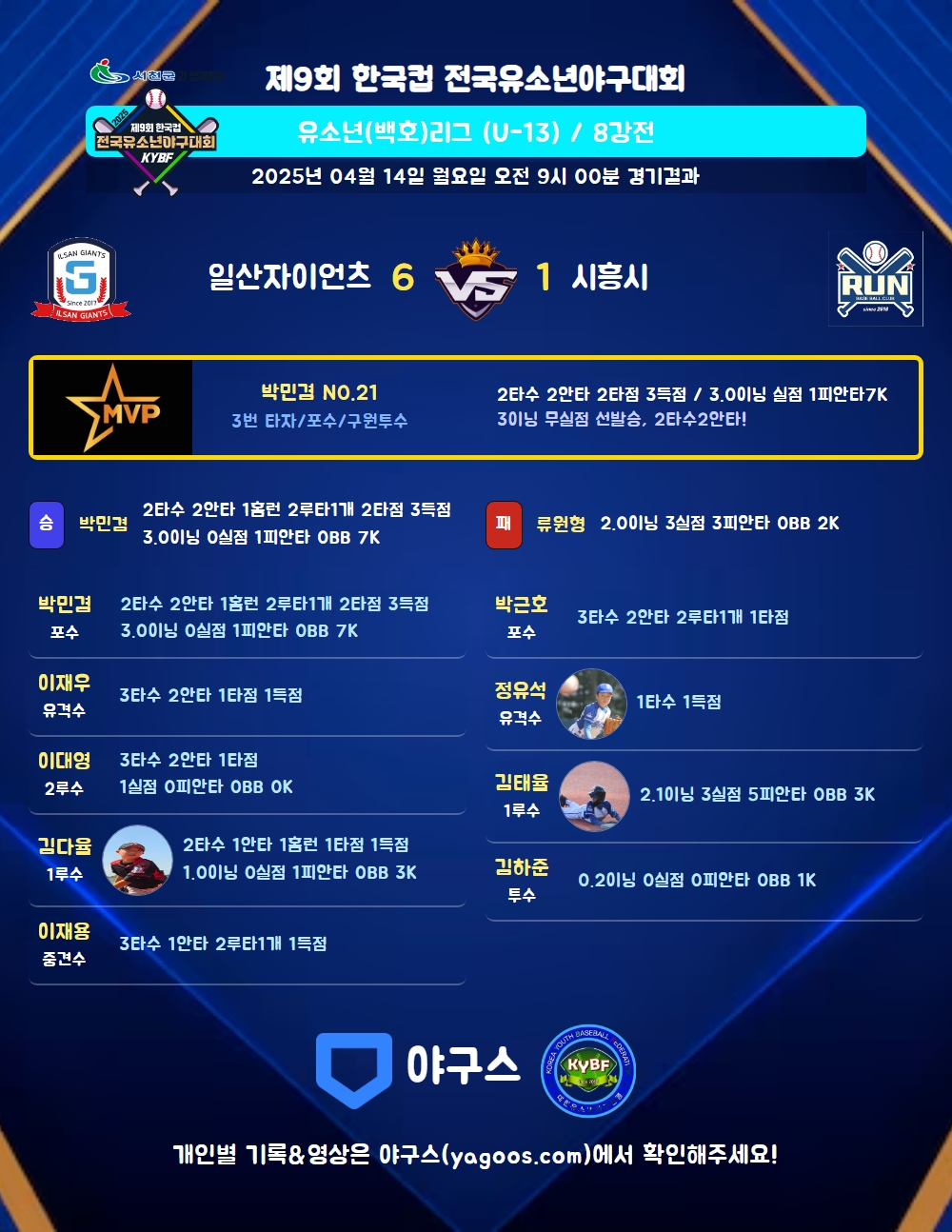 | 1 | 박민겸(21) | 승 | 3.0 | 14 | 11 | 1 | - | 2 | 7 | 47 | - | - | 0 |