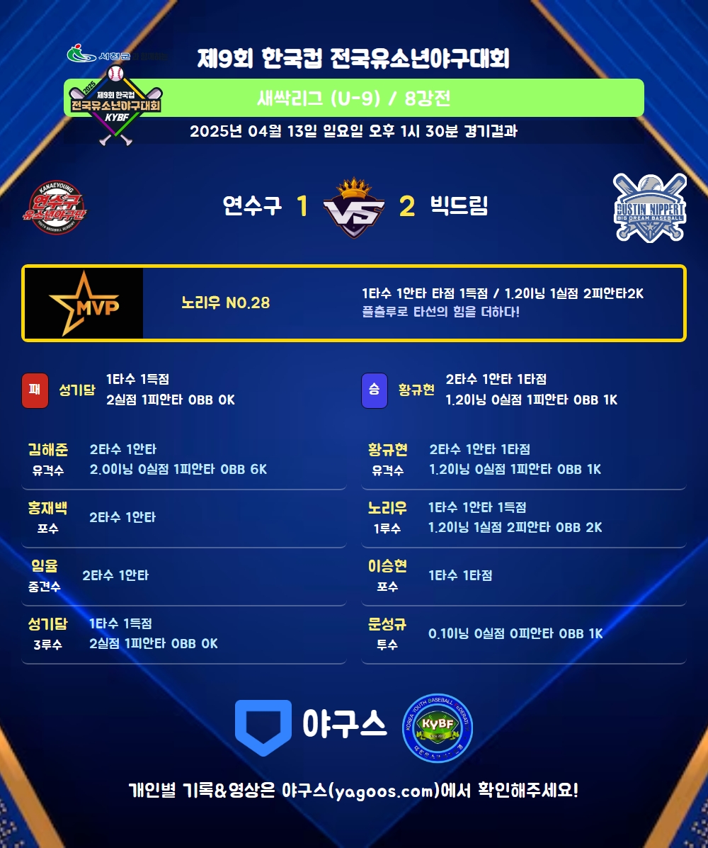 | 2 | 황규현(9) | 승 | 1.2 | 6 | 6 | 1 | - | - | 1 | 27 | - | - | 0 |