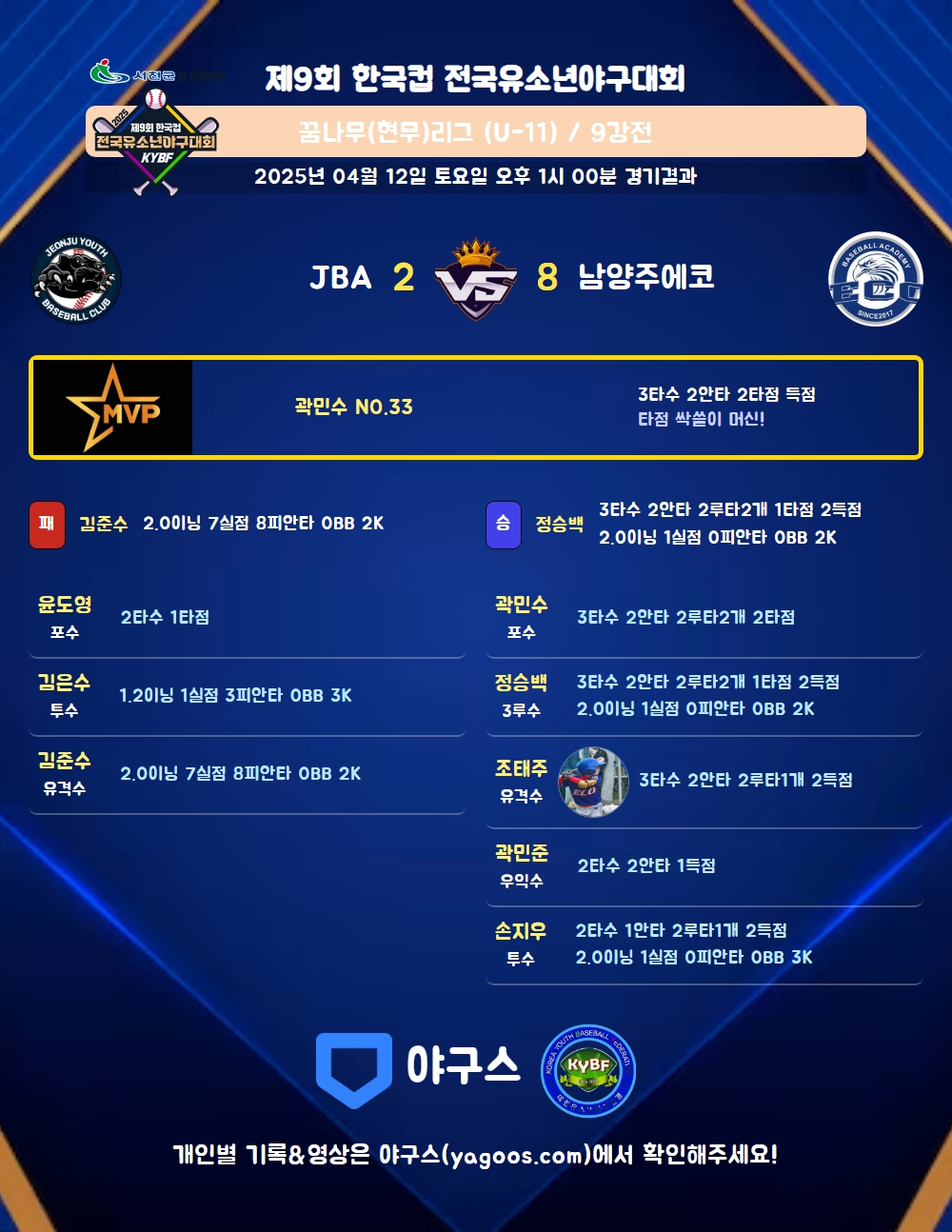| 2루타 | 조태주(9) 손지우(22) 정승백(11) 곽민수(33) |