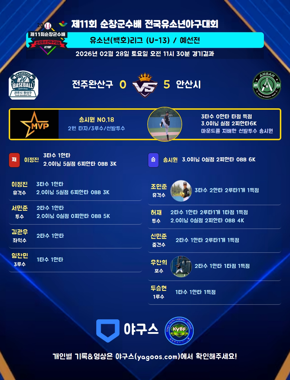 | 1 | 송시원(18) | 승 | 3.0 | 11 | 11 | 2 | - | - | 6 | 23 | - | - | 0 |