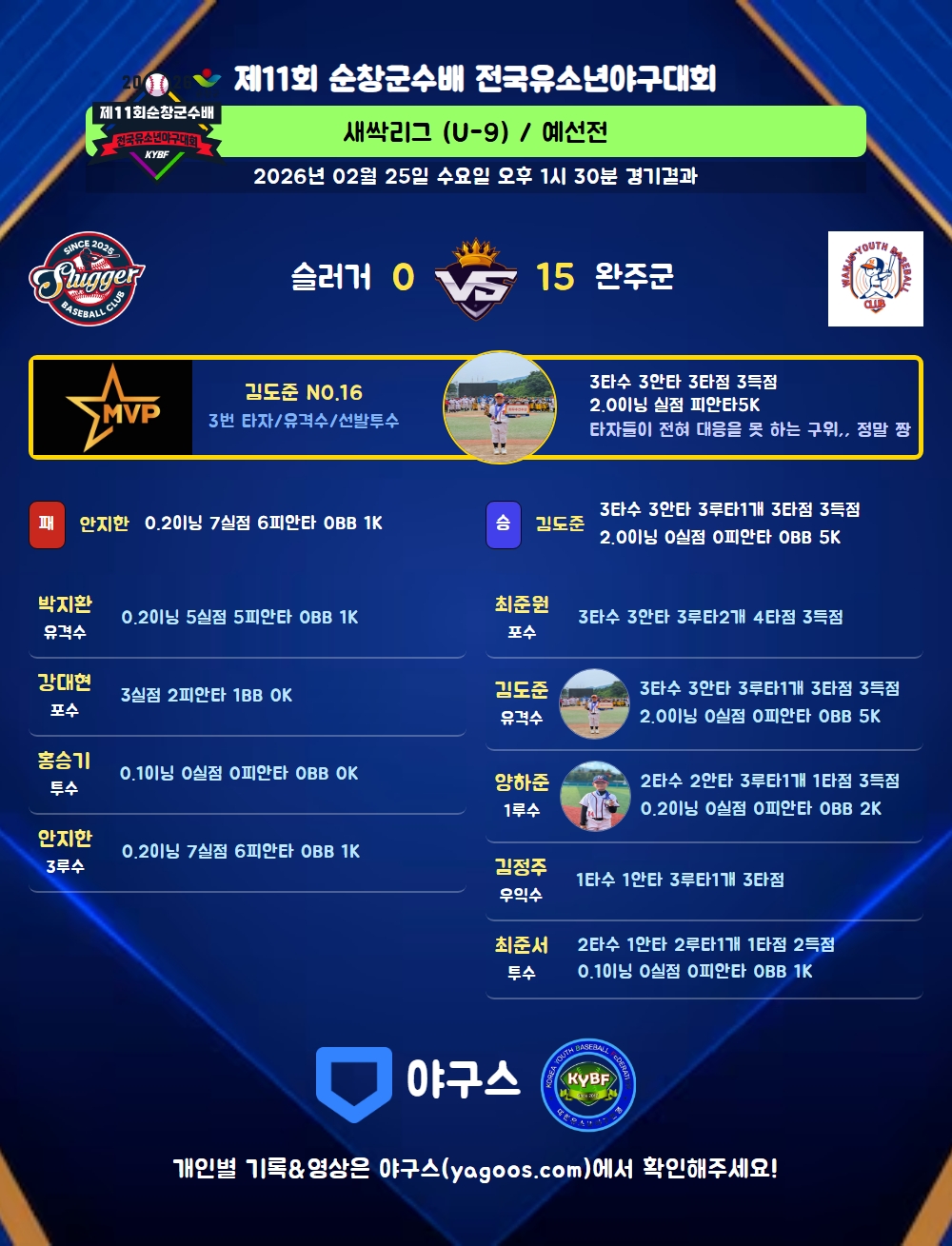 | 1 | 김도준(16) | 승 | 2.0 | 7 | 6 | - | - | 1 | 5 | 31 | - | - | 0 |