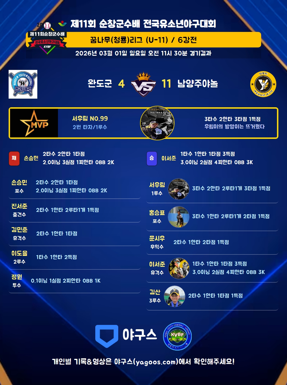 | 4 | 좌 | 김산율(17) | 낫아웃삼진 | - | 낫아웃삼진 | - | 2 | - | - | - | - | - | - | 2 | 0.000 |
