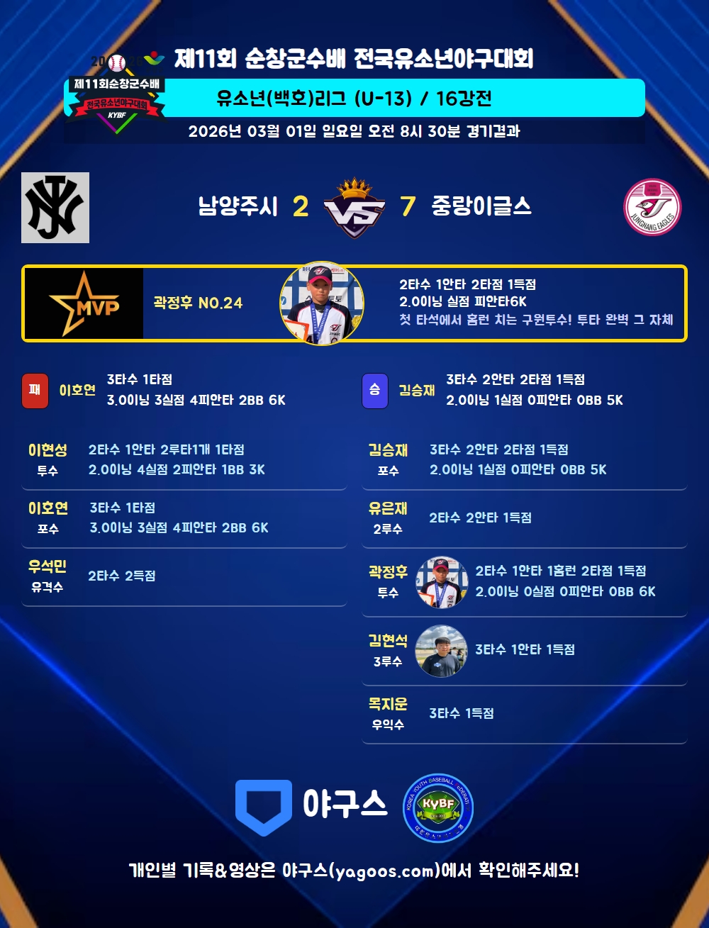 | 2 | 투 | 곽정후(24) | 좌중홈(1타점) | 3실 | - | 4구(1타점) | - | - | 2 | 1 | 2 | 1 | 1 | - | 1 | - | 0.500 |