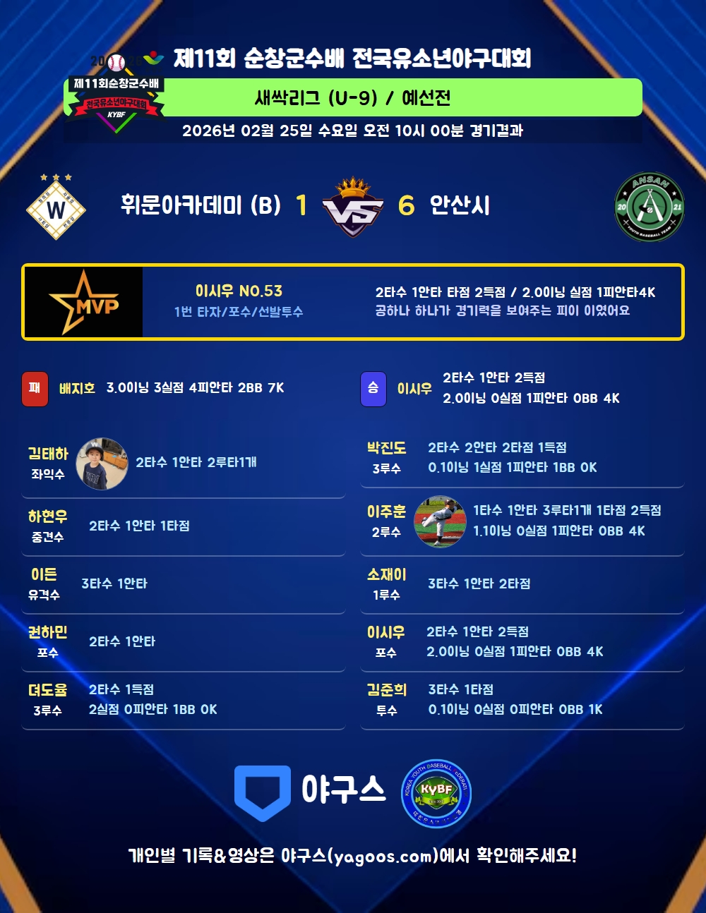 | 1 | 이시우(53) | 승 | 2.0 | 6 | 6 | 1 | - | - | 4 | 14 | - | - | 0 |