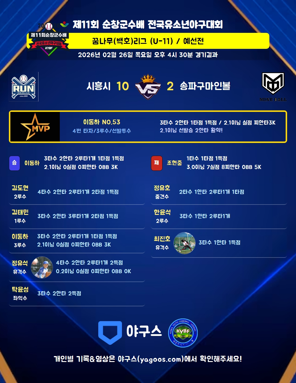 | 2루타 | 김도현(3) 정유석(15) 이동하(53) 이재희(42) 한윤석(7) 정유호(22) |