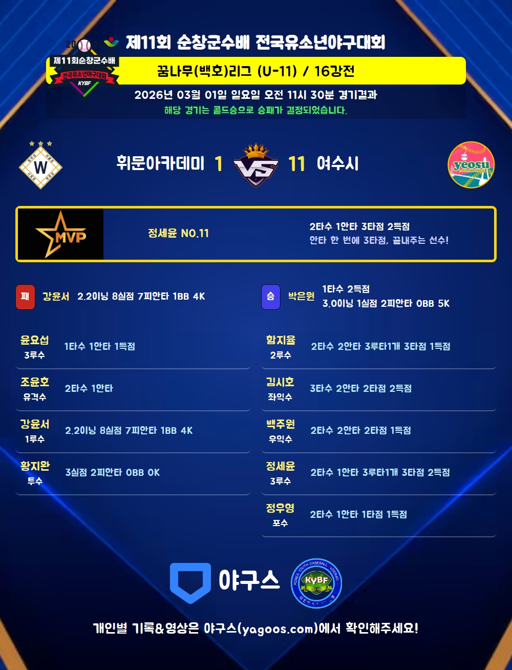 | 5 | 三 | 정세윤(11) | 사구 | - | 유실/우전3(3타점) | 2 | 1 | 3 | 2 | - | - | 1 | - | 0.500 |