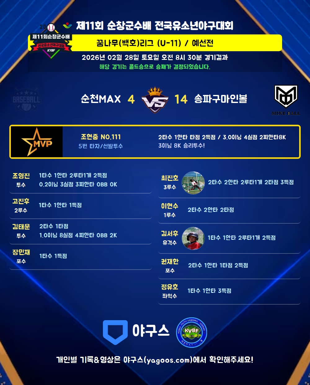 | 5 | 투 | 조현중(111) | 4구 | 2플 | 투내안 | 2 | 1 | - | 2 | - | 1 | 1 | - | 0.500 |