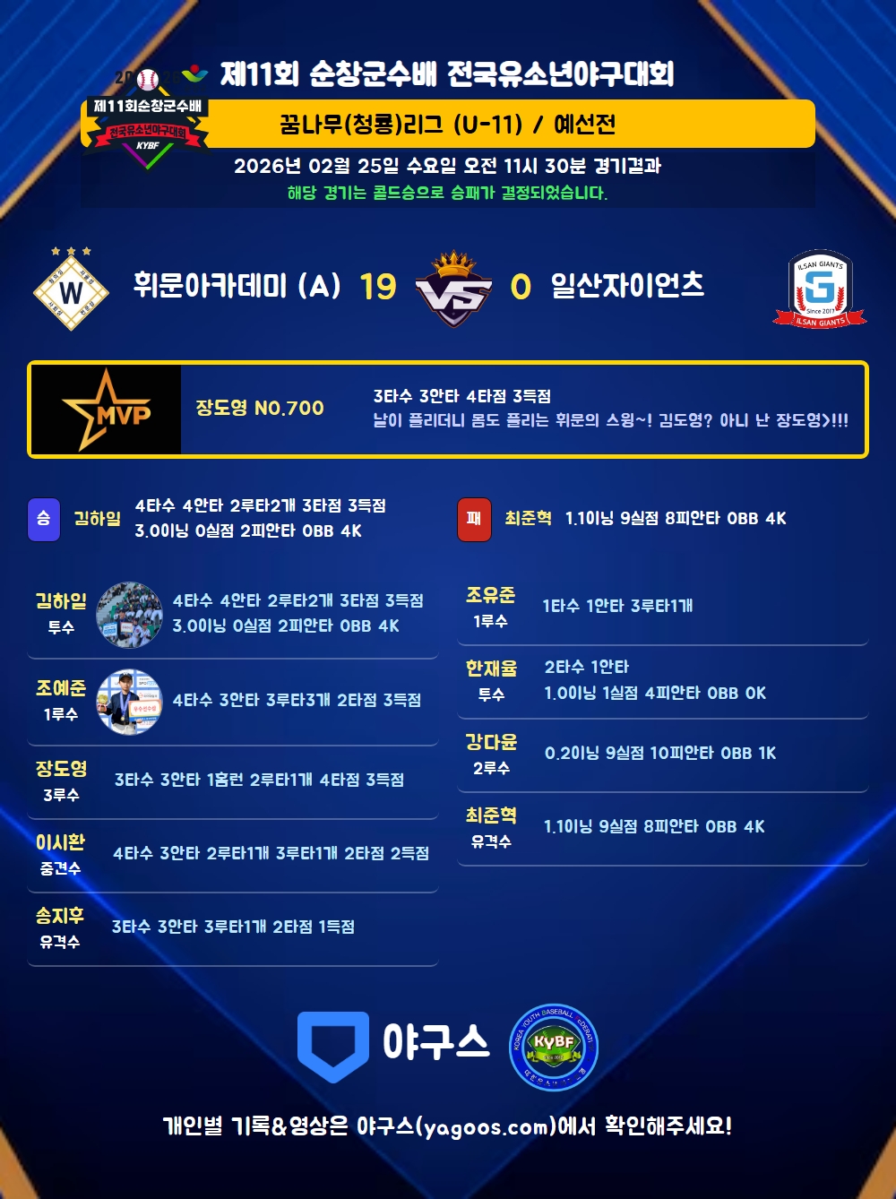 | 3루타 | 이시환(41) 조예준(8) 김윤준(29) 송지후(11) 조유준(62) |