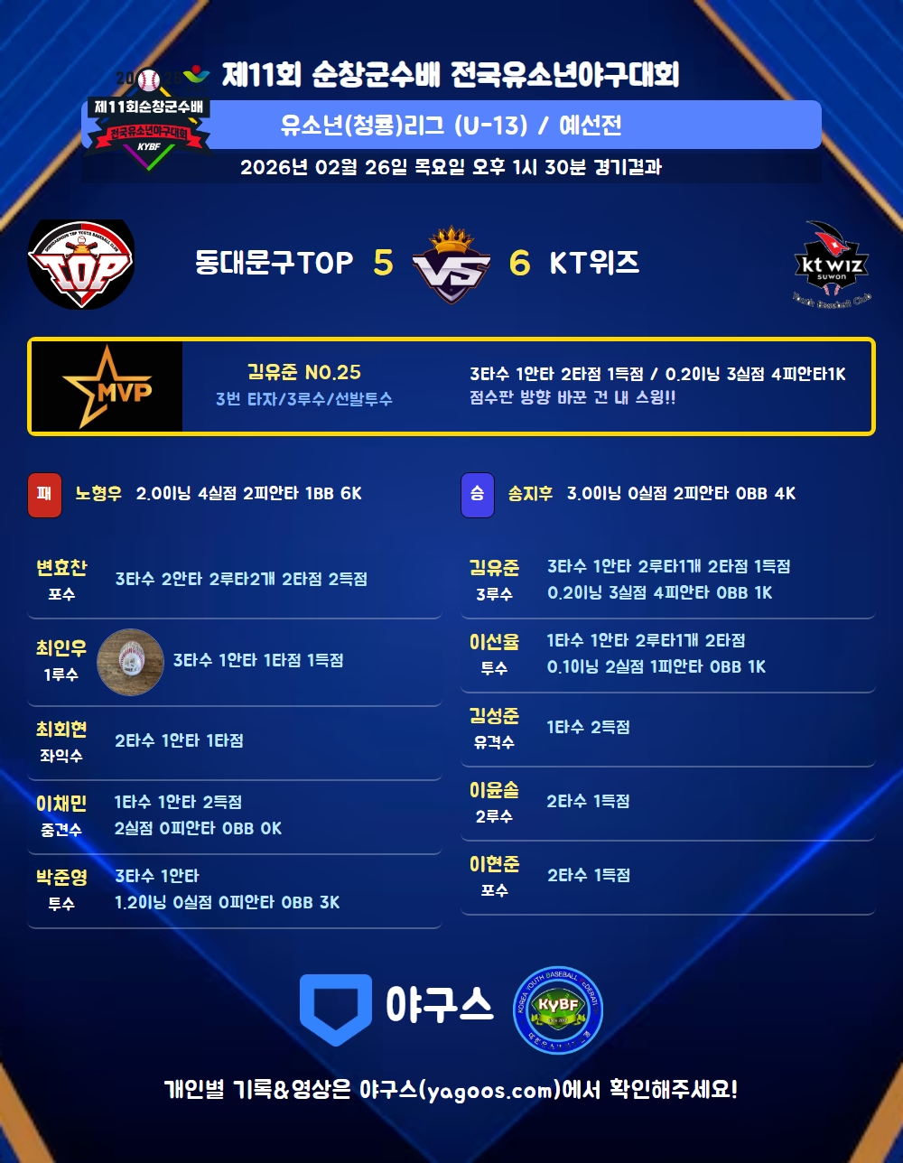 | 1 | 김유준(25) | - | 0.2 | 7 | 6 | 4 | - | 1 | 1 | 31 | 3 | 3 | 0 |