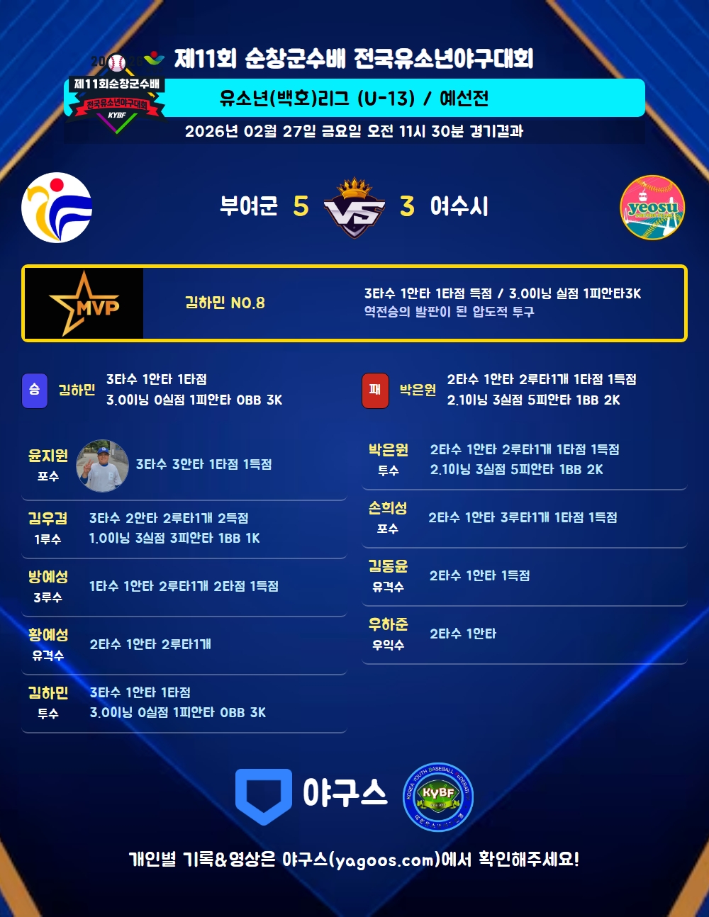 | 5 | 투 | 김하민(8) | 우플 | - | 삼진 | 좌안(1타점) | - | 3 | 1 | 1 | - | - | - | - | 1 | 0.333 |