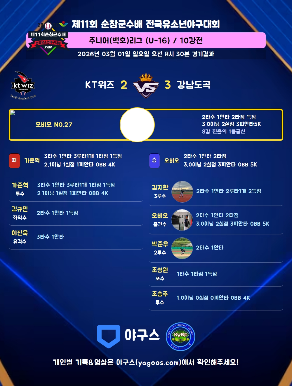 | 2 | 투 | 가준혁(17) | 삼진 | - | 좌중3(1타점) | 3땅 | 3 | 1 | 1 | 1 | - | 1 | - | 1 | 0.333 |