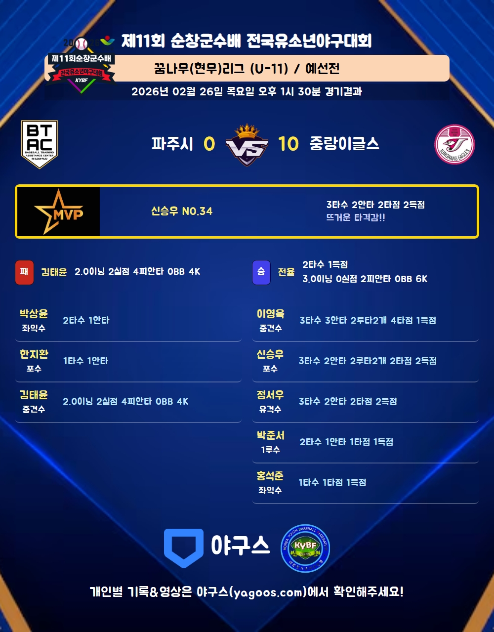| 1 | 一 | 박준서(2723) | 유내안 | 삼진 | 4구(1타점) | 2 | 1 | 1 | 1 | - | - | 1 | 1 | 0.500 |