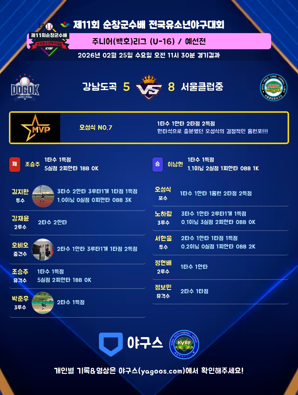 | 5 | 투 | 서한울(160) | 우월안(1타점) | 2땅 | - | - | - | 2 | 1 | 1 | 1 | - | 1 | - | - | 0.500 |