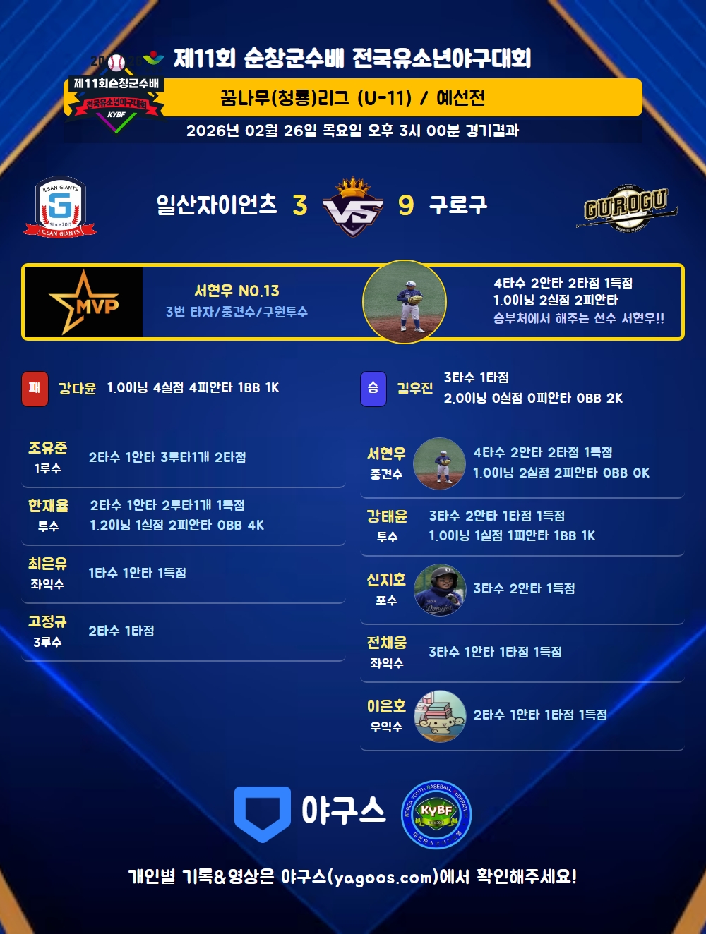 | 일산자이언츠 | 0 | 0 | 2 | 1 | 0 | 3 | 3 | 1 | 3 | 1 |